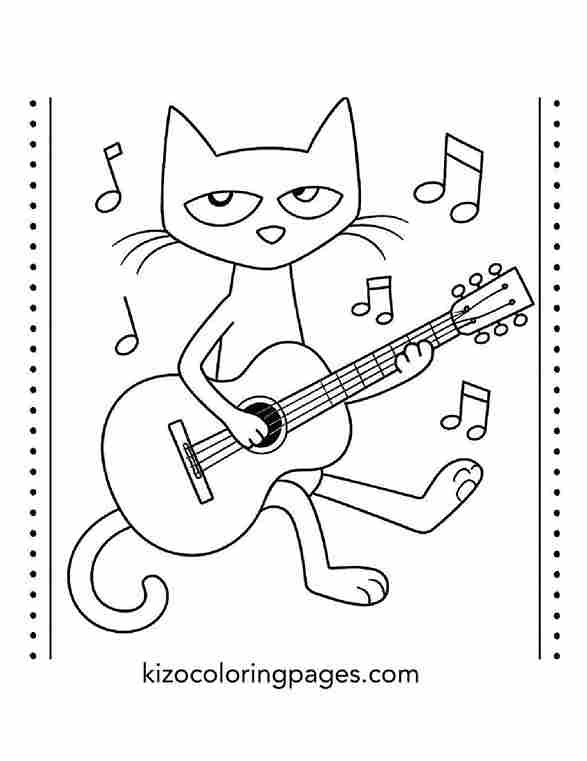 A cute cartoon cat joyfully plays guitar with music notes around, perfect for kids’ creative coloring and fun activity time.